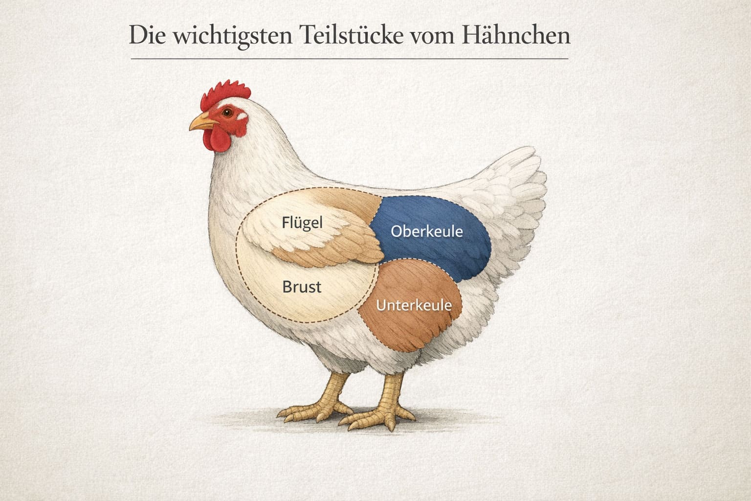 Hähnchenbrust gilt oft als der Standard-Cut schlechthin – fettarm, unkompliziert, aber leider auch häufig trocken und wenig aufregend. Dabei hat ein Hähnchen so viel mehr zu bieten als nur das helle Brustfleisch. Von saftigen Schlegeln über zartes Innenfilet bis zu knusprigen Flügeln: Jedes Teilstück bringt seine eigene Struktur, seinen eigenen Geschmack und seine ideale Zubereitungsart mit. Wer die Vielfalt der Hähnchen-Teilstücke kennt, kann gezielter einkaufen, abwechslungsreicher kochen und vor allem: intensiver genießen. In diesem Artikel zeigen wir dir, welche Cuts es gibt, wo sie am Tier sitzen und wie du das Beste aus jedem Teilstück herausholst.