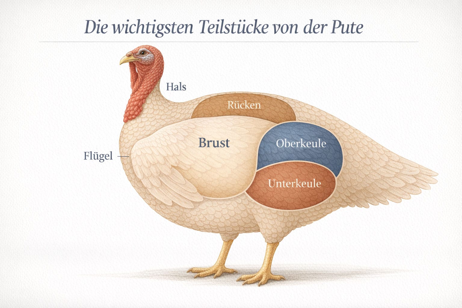 Putenfleisch hat einen Ruf: mager, hell, manchmal trocken. Viele greifen automatisch zur Brust, weil sie schnell zubereitet ist. Doch wer sich nur auf diesen einen Cut beschränkt, verpasst eine bemerkenswerte Vielfalt. Die Pute bietet weit mehr als das klassische Schnitzel: von saftig-dunkler Keule über aromatische Flügel bis zu feinen Innereien. Jedes Putenfleisch Teilstück hat seinen eigenen Charakter, seine ideale Zubereitungsart und seinen Platz in der Küche.